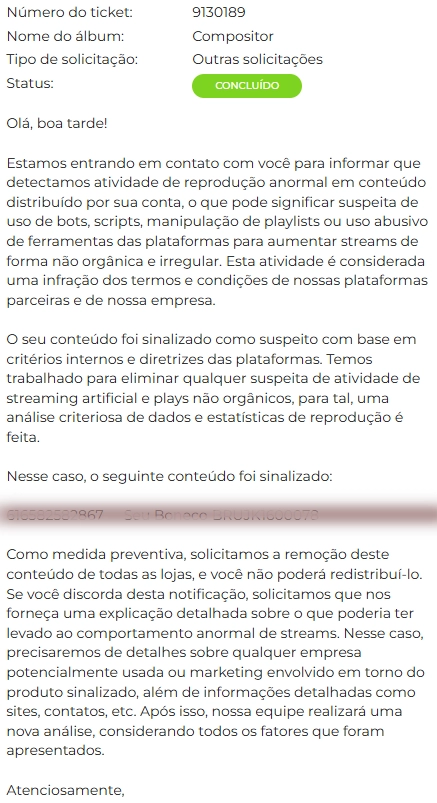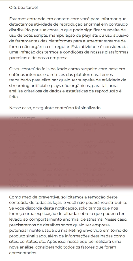 Não é apenas o Spotify que pune o artista. As distribuidoras digitais (como a que enviou o comunicado abaixo) são as primeiras a serem cobradas pelas plataformas. Elas funcionam como filtros de qualidade e segurança.